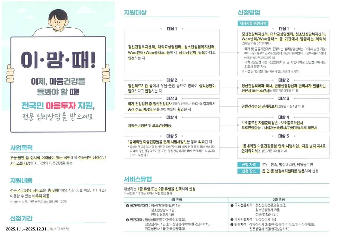 이 사업은 단순히 상담을 제공하는 것을 넘어, 마음 건강의 중요성을 사회적으로 알리고 국민 모두가 쉽게 심리 상담을 받을 수 있는 환경을 조성하는 데 기여하고 있습니다.