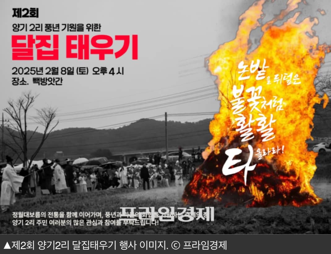 보령시 양기 2리에서는 정월대보름을 기념하여 마을 주민이 함께하는 달집태우기 행사가 진행된다. 지난해 처음 개최된 행사로, 마을의 화합과 풍년을 기원하는 의미를 담고 있다. 주민들은 각자의 소망을 적은 소원지를 준비해 달집에 걸고, 저녁이 되면 함께 불을 붙이며 한 해의 액운을 태워버리는 시간을 갖는다. 행사 당일에는 전통 먹거리 나눔 행사도 함께 진행될 예정이다.